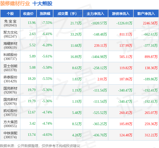个股表示方面,该股当日报收13。96,下跌7。55%,成交量21。73万,从力资金净流出1020。57万元。聚力文化(002247)以下跌6。41%紧随其后,该股当日成交量33。29万,从力资金净流出148。48万元。除此之外,海螺新材(000619)、科顺股份(300737)、亚士创能(603378)均进入当日熊股之列。具体个股列表见下表。